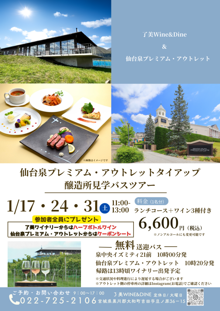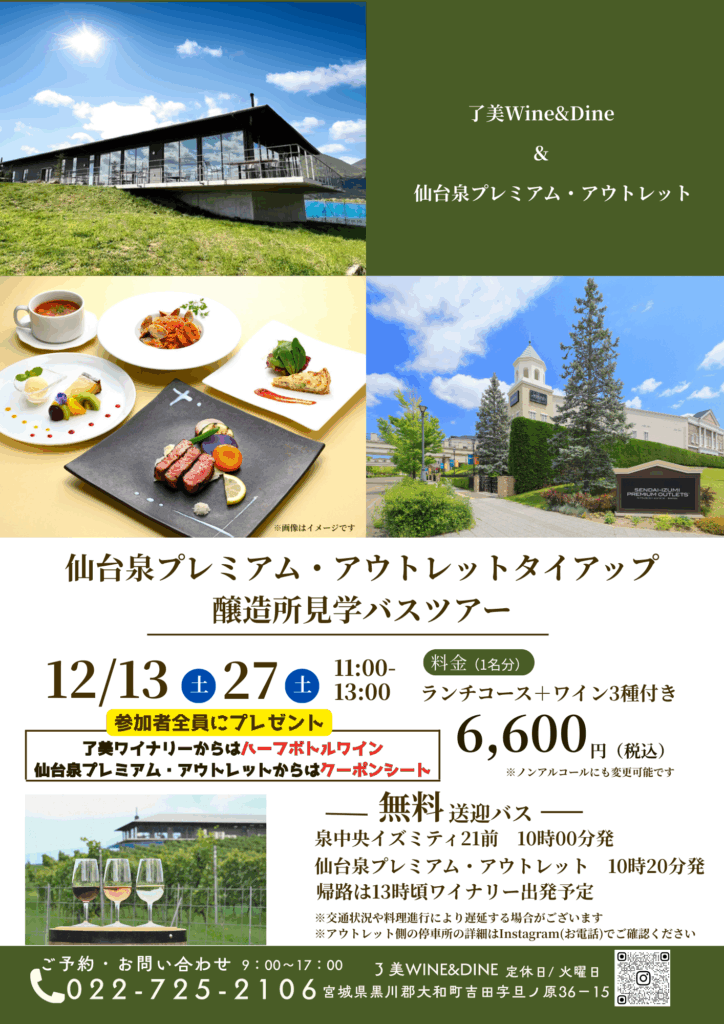 了美ワイナリーの見学ツアーを楽しんだ後、そのまま仙台泉プレミアム・アウトレットでショッピングをお楽しみください🛍